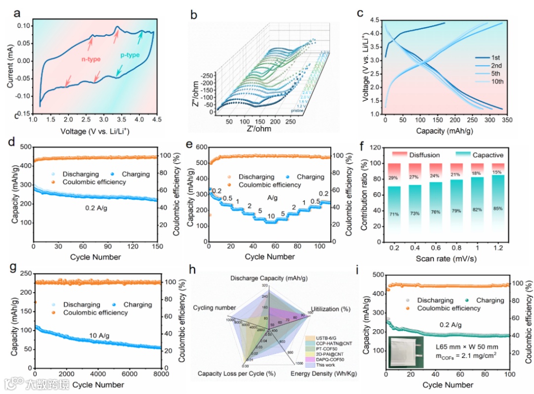 图3. (a) 扫速率为0.2 mV s-1时的CV曲线;(b) 不同电压状态下阻抗图谱;(c-d) 0.2 A g-1电流密度下放电/充电曲线和200圈循环图;(e) 在电流密度下的倍率性能;(f) 在0.2-1.2 mV S-1范围内不同扫速下赝电容控制占比;(g) 在10 A g-1下8000次长循环图谱;(h) BTT-PTO-COF材料与文献中具有代表性的COFs正极材料的电池性能比较;(i) 软包电池在0.2 A g-1下循环100次的性能。