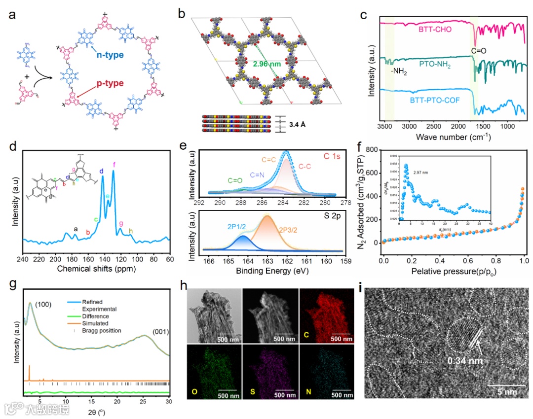 图1为BTT-PTO-COF的合成过程和表征结果:包括相应的傅里叶变换红外光谱(FT-IR)谱图,13C固体核磁共振(NMR)谱图,X射线光电子能谱(XPS)图谱,粉末X射线衍射(PXRD)图谱, 氮气吸附等温线,扫描电子显微镜(SEM)图像,透射电子显微镜(TEM),以及能量色散光谱(EDS)元素分布。