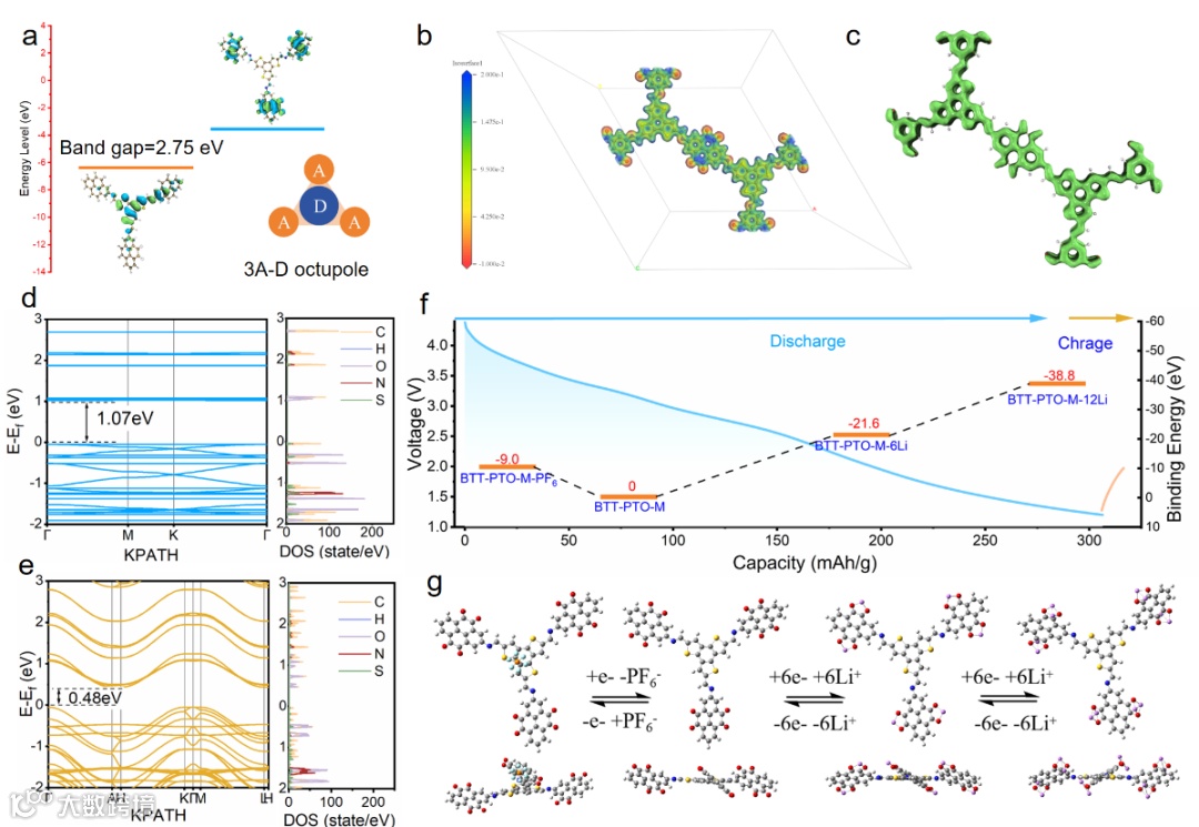 图 5. DFT计算:(a-b) LUMO,HOMO和静电势;(b) LOL-π电子离域结构;(d)单层和(e)多层BTT-PTO-COF的能带结构和分波态密度;(f) 储能机理示意图和相应的结合能;(g) 锂化/脱锂过程中结构演变过程。