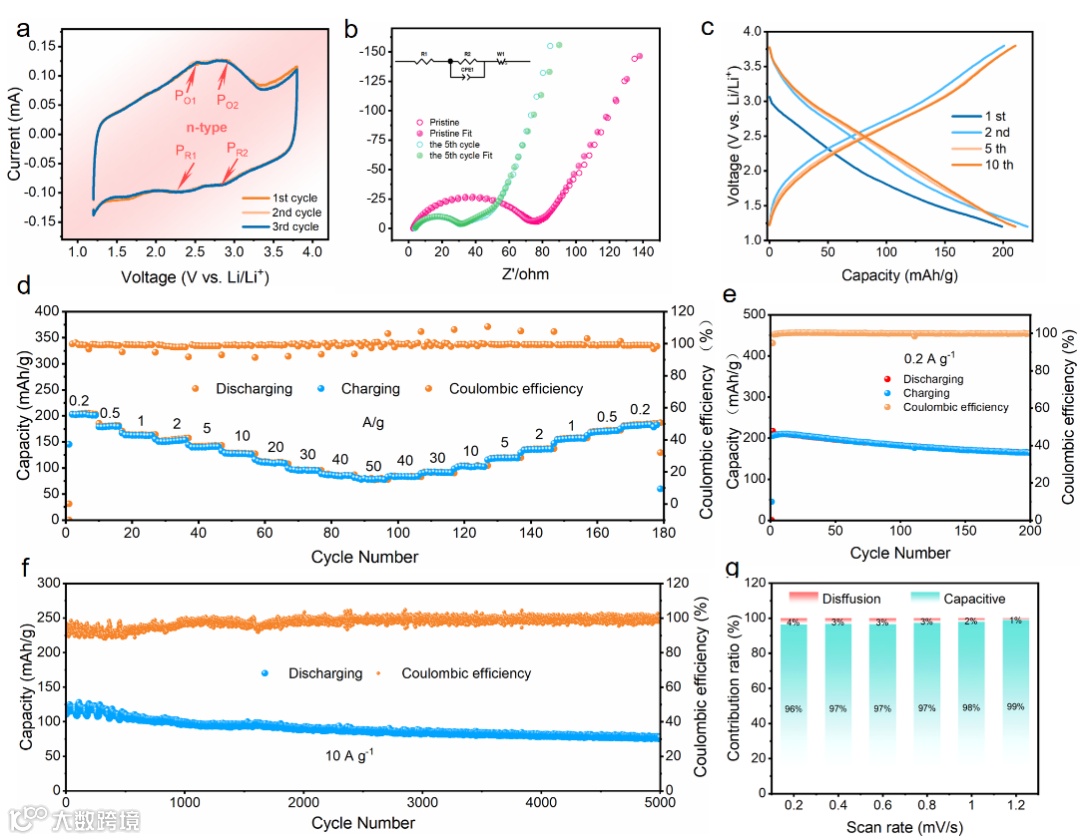 图2. (a)扫速率为0.2 mV s-1时的CV曲线;(b)阻抗图谱;(c) 0.2 A g-1电流密度下放电/充电曲线;(d)在不同电流密度下的倍率性能;(e) 0.2 A g-1电流密度下200次长循环图;(g)在10 A g-1下5000次循环的长周期稳定性;(f)在0.2-1.2 mV S-1不同扫速下赝电容控制占比。