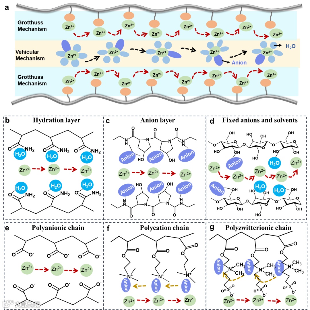 图7(a)凝胶电解质中离子传输过程的示意图。(b-g)不同聚合物中离子通过结构扩散传输的机制。(b)具有水合层的聚合物表面上的离子传输;(c)阴离子在聚合物表面上的离子传输;(d)阴离子和水分子在聚合物表面上的离子传输;(e)聚阴离子链上的离子传输;(f)聚阳离子链上的离子传输;(g)聚两性离子链上的离子传输。