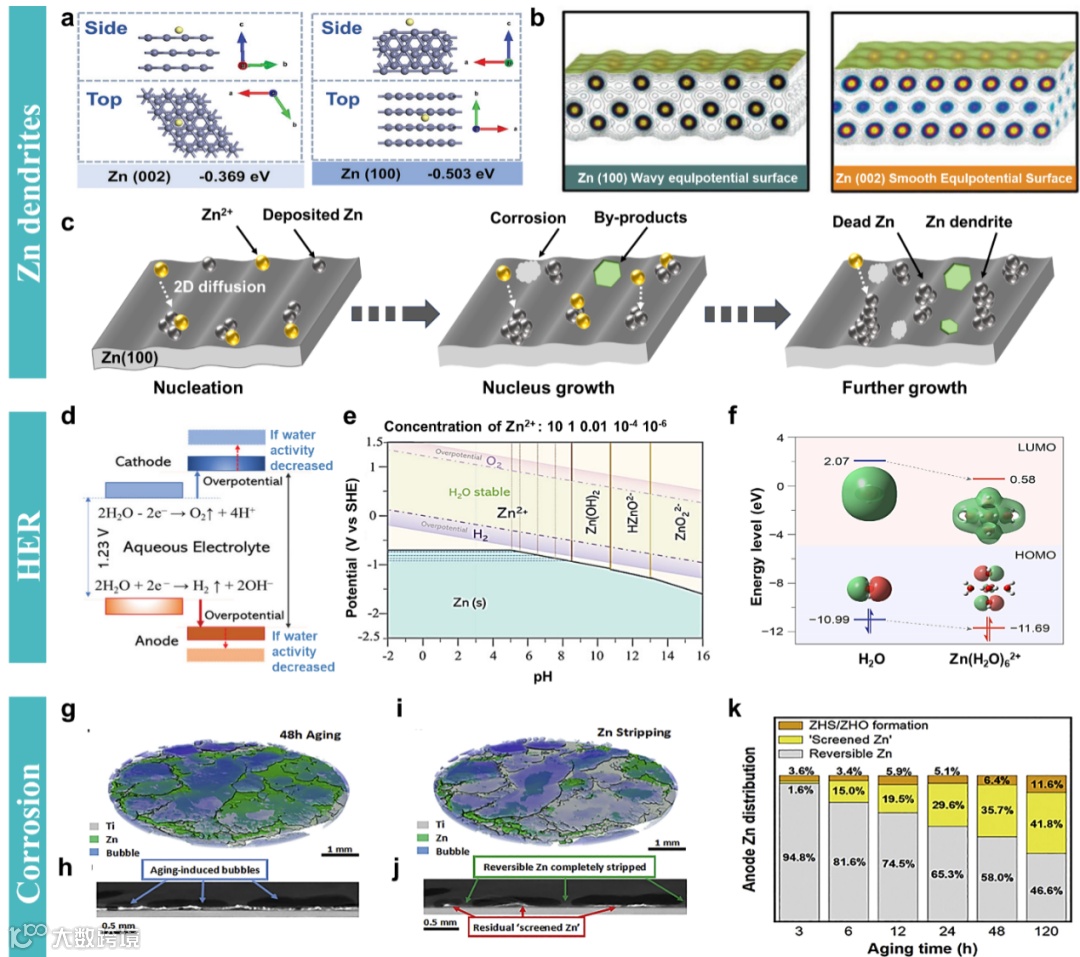 图2 锌负极存在的问题。(a-c)锌枝晶,(d-f)析氢反应,(g-k)自腐蚀。