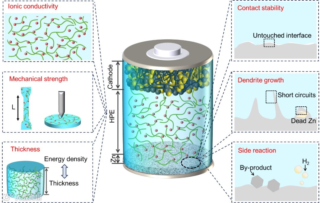 图1. 水凝胶电解质在水系锌离子电池应用中存在的关键问题。