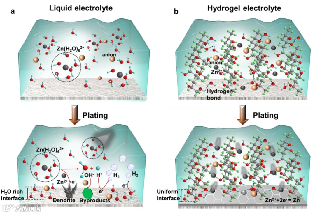 图9 Zn沉积示意图,(a)液体电解质,(b)水凝胶电解质。