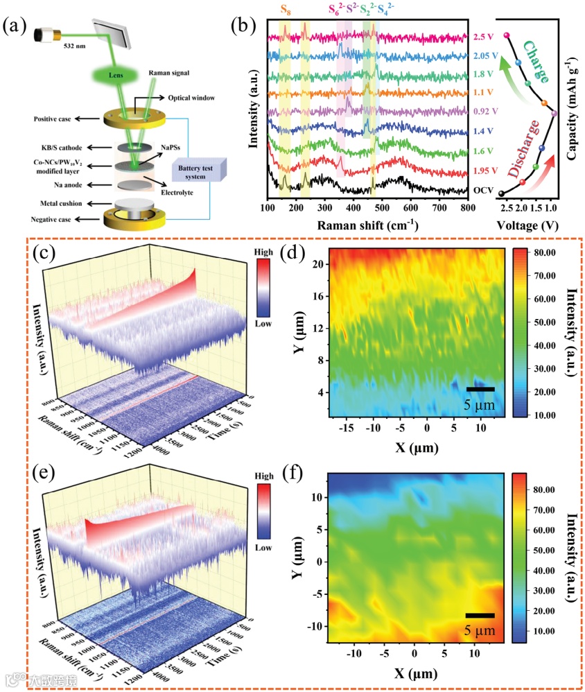 图1. (a)原位拉曼电化学池组装及工作机制示意图;(b)Co-NCs/PW10V2改性隔膜在恒流充放电过程中的原位拉曼光谱图;(c, e)PW10V2在充放电过程中的原位拉曼电化学表征;(d, f)充放电过程中在1010 cm-1处特征峰强度变化的原位拉曼映射图