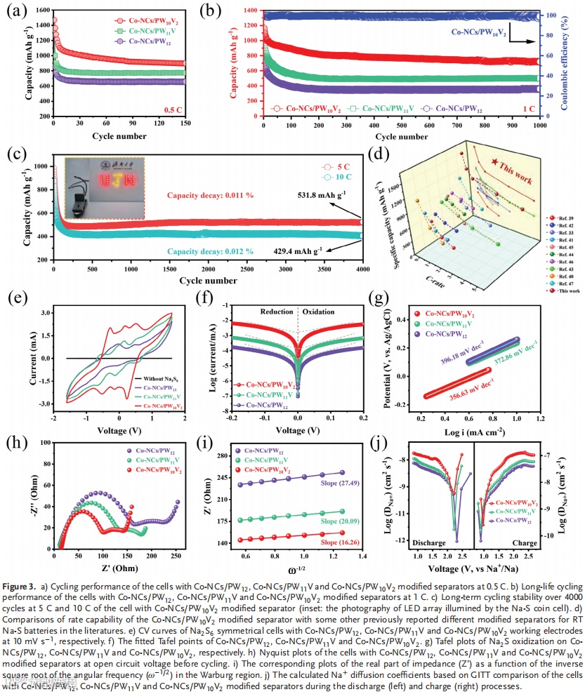 图4. (a-c)Co-NCs/PW10V2改性隔膜在0.5 C、1 C、5 C和10 C下的循环性能;(d)Co-NCs/PW10V2改性隔膜与之前报道的室温钠硫电池的其他改性隔膜之间的电化学性能比较;(e)Na2S6对称电池在10 mV s-1下的CV曲线;(f)Na2S6对称电池的Tafel图;(g)硫化钠氧化反应的Tafel曲线图;(h)Co-NCs/PW10V2改性隔膜循环前的Nyquist图;(i)在低频区域中Z‘与ω-1/2的关系;(j)Co-NCs/PW10V2改性隔膜的Na+扩散系数