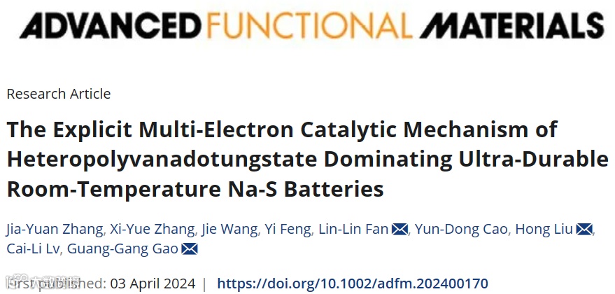 近日,来自济南大学的高广刚教授,在国际知名期刊Advanced Functional Materials上发表题为“The Explicit Multi-Electron Catalytic Mechanism of Heteropolyvanadotungstate Dominating Ultra-Durable Room-Temperature Na-S Batteries”的观点文章。该观点文章首次揭示了具有精确钒(V)取代位点的Keggin型多金属氧酸盐H5PW10V2O40·30H2O (PW10V2)分子簇催化剂在室温钠硫电池循环过程中的精确电子转移行为以及独特的双向催化机制。得益于精确的V活性位点和高度可逆的多电子氧化还原性质,具有多中心活性位点的PW10V2可以有效地捕获多硫化物,并加速了多硫化物与不溶性硫化钠之间的完全转化,同时伴随着其本身还原态和氧化态之间的可逆转化。本工作首次展示了POM基功能材料在室温钠硫电池中的潜在电化学反应过程,为解决室温钠硫电池中多硫化钠的挑战性问题提供了理论指导。