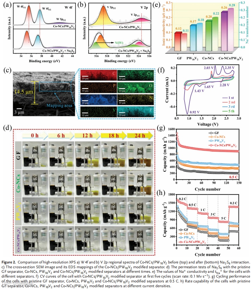 图2. (a, b)Co-NCs/PW10V2吸附Na2S6后的W 4f和V 2p XPS光谱;(c)Co-NCs/PW10V2改性隔膜的截面SEM图像和相应的元素图谱;(d)Co-NCs/PW10V2改性隔膜的渗透试验;(e)Co-NCs/PW10V2改性隔膜的Na+电导率和Na+迁移数;(f)Co-NCs/PW10V2改性隔膜在0.1 mV s-1下的CV曲线;(g)Co-NCs/PW10V2改性隔膜在0.5 C下的循环性能;(h)Co-NCs/PW10V2改性隔膜在不同电流密度下的倍率性能