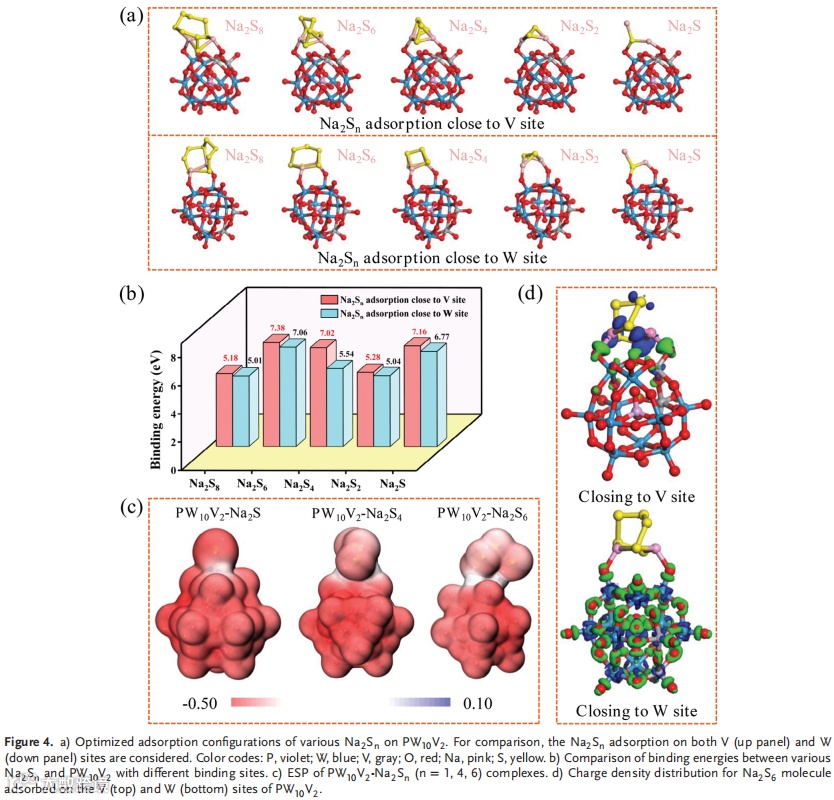 图3. (a)Na2Sn在PW10V2上不同活性位点的吸附构型;(b)Na2Sn与PW10V2上不同活性位点之间的结合能比较;(c)Na2Sn与PW10V2结合的静电势图像;(d)Na2S6分子吸附在PW10V2不同活性位点的差分电荷密度图像