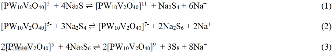 具有精确V活性位点的PW10V2遵循两步1,2-电子传递机制,具有较强的再氧化活性,这为多硫化物的快速转化奠定了基础。通过原位拉曼测试技术实时监测在电化学反应进程中硫物种的演变过程,在充放电循环过程中,S8 Na2S6 Na2S4 Na2S2 Na2S的全部可逆转变表明PW10V2催化剂能实现S8与Na2S2/Na2S之间的高度可逆反应。在充电过程中,还原性Na2S2/Na2S催化氧化为高阶多硫化物的过程是通过低阶多硫化物向[PW10V2O40]5-多阴离子簇的多电子转移进行的,并伴随着还原性产物杂多蓝的生成。在放电过程中,还原态PW10V2进行可逆的电子转移,能继续催化S8转化并生成Na2S2/Na2S,同时,杂多蓝被可逆的氧化回原始的PW10V2。基于PW10V2的室温钠硫电池在充放电过程中的多步可逆电子转移行为,其催化反应机理可以总结为: