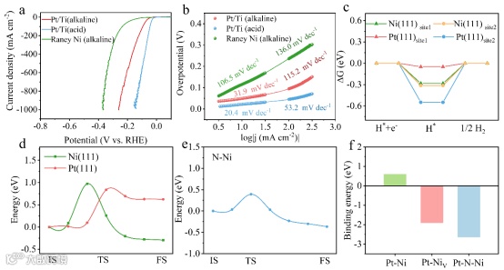 首先评估了Pt/Ti与商用雷尼镍在不同电解液中的HER活性,发现Pt/Ti在小电流密度下表现出优异的催化活性和低Tafel斜率,而大电流密度下在碱性电解液中的Tafel斜率显著增加,接近雷尼镍的值。计算结果显示Pt(111)表面的ΔGH*接近于0,但水的解离能达到0.84eV,说明Pt/Ti在大电流密度下受到水解离步骤的限制。为了最大程度发挥Pt的活性,本文提出将水解离过程和析氢过程在空间上解耦的策略,即由基底提供足量的H*以匹配Pt表面H2释放速率。进一步计算得到N掺杂Ni表面的水解离能仅为0.39 eV,并且与Pt有较强的结合,理论上能够提升催化剂在大电流密度下的催化活性和稳定性。