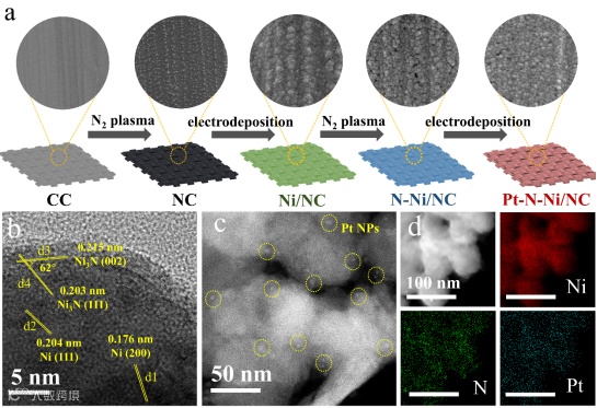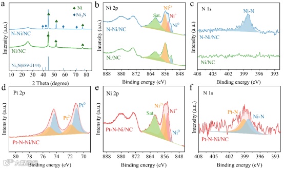 基于理论指导,研究人员采用分步电沉积和等离子体改性技术,制备了负载在N掺杂Ni表面的铂纳米颗粒复合材料。电镜结果显示,在100 nm左右的球形纳米粒子表面,均匀分布着尺寸为2 nm左右的纳米颗粒。结合制备过程和元素映射图,可以确定较大的球形颗粒是Ni,表面的超细纳米粒子为Pt,Pt的质量分数仅为1.0 wt%。此外,Ni颗粒表面观察到了Ni3N,证明了表面N掺杂。XRD结果表明,第一步电沉积生成了Ni金属相,N2等离子体处理将部分Ni转化为Ni3N。N-Ni/NC的Ni 2p和N 1s XPS谱再次证明了N的掺杂以及Ni电子环境的变化。Pt-N-Ni/NC的Pt 2p XPS光谱对应于Pt的金属特性,N 1s XPS光谱观察到对应于Pt-N的峰,表明在电沉积过程中Pt与N成键。