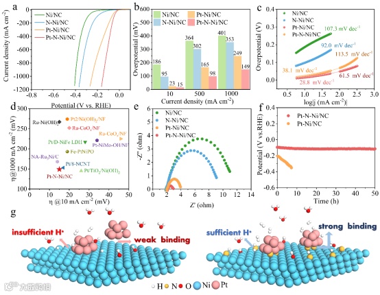 在1 M KOH中测试了样品的HER催化活性性能,以Ni作为负载基底的样品(Pt-Ni/NC)作为对比。可以看到Pt-Ni/NC和Pt-N-Ni/NC只需23和15 mV的过电位即可达到10 mA cm-2的电流密度。随着电流密度增加,Pt-N-Ni/NC的过电位增长速率明显小于Pt-Ni/NC,达到1000 mA cm-2仅需149 mV过电位,而Pt-Ni/NC需249 mV。此外,催化剂长期稳定性表明Pt-N-Ni/NC的稳定性显著高于Pt-Ni/NC。与近年来报道的贵金属基HER催化剂性能相比,Pt-N-Ni/NC在小电流和大电流密度下均表现出极佳的性能。等离子体处理得到的N-Ni/NC基底具有双重作用:一方面,提供了快速水解离表面,确保足量H*供应;另一方面,与Pt形成稳定结合,保证催化剂的稳定性。