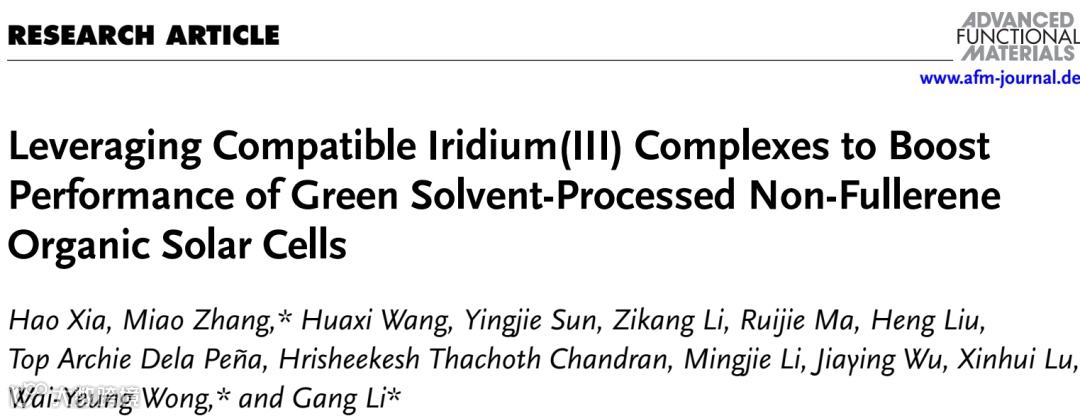 利用良好相容性铱(III)配合物提高绿色溶剂处理非富勒烯有机太阳能电池的性能