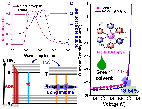 1. 开发了具有强磷光发射的新型铱金属配合物fac-Ir(tBufppy)3,由于其特殊的空间立体结构,在活性层形貌调控上具有显著优势,使得基于 PM6:10%fac-Ir(tBufppy)3:BTP-eC9 的器件实现了18.54%的高效PCE,远超二元标准器件PM6:BTP-eC9效率(17.41%)。