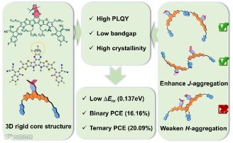 突破性进展:在有机太阳能电池(OSCs)领域,非辐射能量损失(∆Enr)的降低与电池性能的提升一直是研究的热点。青岛大学薄志山教授,刘亚辉教授和路皓副教授等在这一领域取得了显著的突破。他们设计并合成了一种新型的A-D-A型融合环电子受体,命名为DM-F,该材料含有刚性三维侧基(图中红色部分),而其分子骨架为平面型。这一创新设计有效抑制了受体分子形成H-聚集体,促进了J-聚集体的形成,并显著提升了受体在薄膜中的光致发光量子产率(PLQY)。