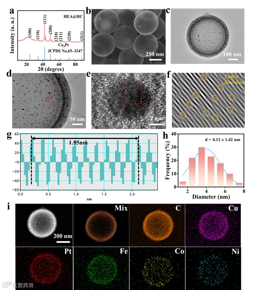 以间苯二酚-甲醛(RF)为碳源,以四乙氧基硅烷为刚性模板,采用简单的一步法制备HC基质。采用典型的湿浸渍法将Pt-、Fe-、Co-、Ni-和CuCl2·2H2O混合前驱体溶液加载到HC基体上。通过热解法制备的单相Pt0.25Cu0.25Fe0.15Co0.15Ni0.2HEA纳米颗粒尺寸约为4.12 nm,均匀分布在空心碳基体上。