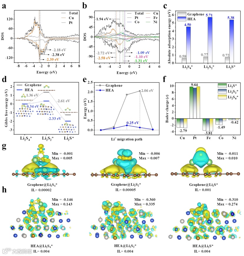 密度泛函理论(DFT)计算揭示HEAs中与电子性质相关的协同调制。Pt作为电子储层,而Cu和Fe主导导带并作为电子消耗位点。剩余的组分赋予了一个平滑和连续调节的电荷,促进了LiPSs的多电子反应。