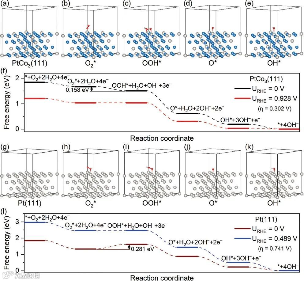 图1 .(a-f) PtCo3(111) 和(g-l) Pt(111)表面上通过缔合机制得到ORR的初始态和中间态的原子构型,以及相应ORR的自由能图。