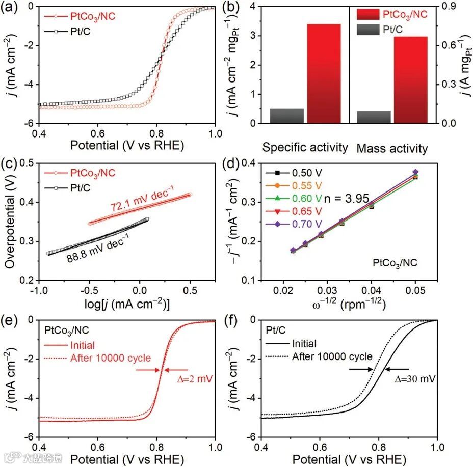 图3. (a) 0.1 M KOH O2饱和条件下的ORR LSV曲线;(b)比活性和质量活性的比较;(c) PtCo3/NC和20 wt .% Pt/C的Tafel斜率;(d) PtCo3/NC上ORR的Koutecky-Levich图;(e,f) PtCo3/NC和20 wt.% Pt/C用于ORR的循环稳定性。