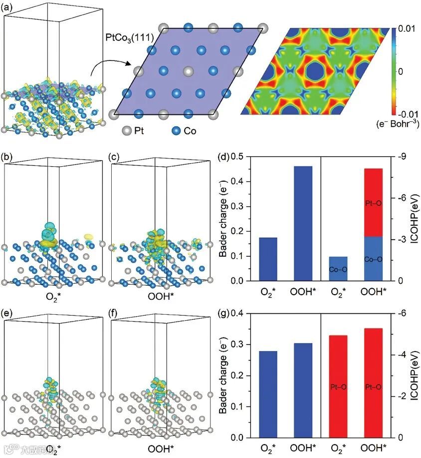 图2 .(a) 原始PtCo3(111)表面的电荷密度差图;(b) O2*吸附和(c) OOH*吸附在PtCo3(111)表面的电荷密度差;(d)对应的Bader电荷和ICOHP值;(e-g) Pt(111)表面的相应数据。