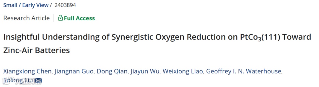 近日,来自中南大学的刘金龙副教授课题组,在国际知名期刊Small上发表题为“Insightful Understanding of Synergistic Oxygen Reduction on PtCo3(111) Toward Zinc-Air Batteries”的研究文章。在这项工作中,作者探索了一种PtCo3纳米颗粒负载在氮掺杂碳上(PtCo3/NC)的低成本ORR催化剂,利用DFT计算和实验验证揭示了催化剂的协同氧化还原机制,证实其具有较高的ORR催化活性,应用于锌-空气电池表现出优异的电池性能。