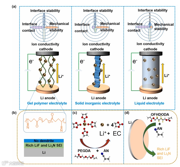 图1. (a)不同电解质的比较。(b)GEL聚合物电解质的结构。(c)去溶剂化过程示意图。(d)富含LiF-Li3N的SEI的设计。