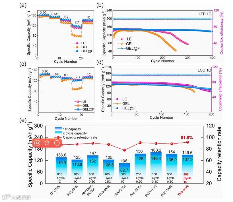 图4 . 使用LFP正极(a、b)和LCO正极(c、d)的LE、GEL和GEL@F的倍率性能和长循环性能。与其他工作的比容量和容量保持率的性能比较(e)。