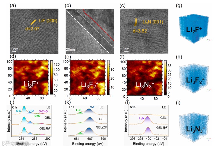 图 5. (a-c)Li|GEL@F|Li电池循环后的TEM图像。GEL@F负极中(d) Li2F+、(e) Li3F2+和(f) Li3N3+的二维热像图以及GEL@F衍生SEI的三维重构图(g-i)。Li|LE|Li、Li|GEL|Li和Li|GEL@F|Li电池在100个循环后的C1s(j)、F1s(k)和N1s(l)的XPS图谱。