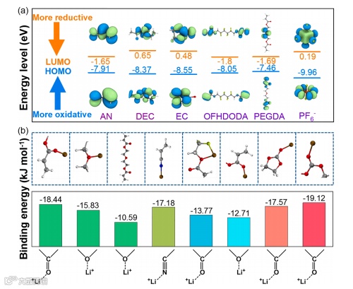图 7. (a) 不同分子的LUMO和HOM能级。(b) Li+与不同分子的结合能以及结合模型。