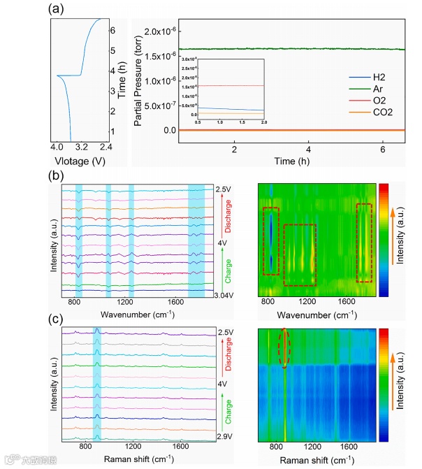 图 6. (a) 匹配LFP正极的GEL@F电池的原位DEMS结果,(b)原位傅立叶变换红外图谱和2D等高线图,(c)原位拉曼图谱和2D等高线图。
