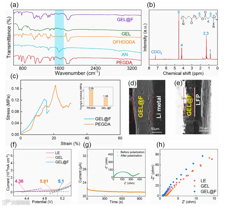 图2 . (a)GEL、GEL@F 和原材料的傅立叶变换红外图谱。(b)GEL@F的1H核磁谱图。(c)PEGDA与GEL@F的压缩应力应变曲线。(d)GEL/Li、(e)LFP/GEL的截面SEM图像。(f)LE、GEL和GEL@F在1mV s-1扫描速率下的线性扫描伏安曲线(LSV)。(g)GEL@F的锂离子迁移数。(h)LE、GEL和GEL@F的离子电导率。
