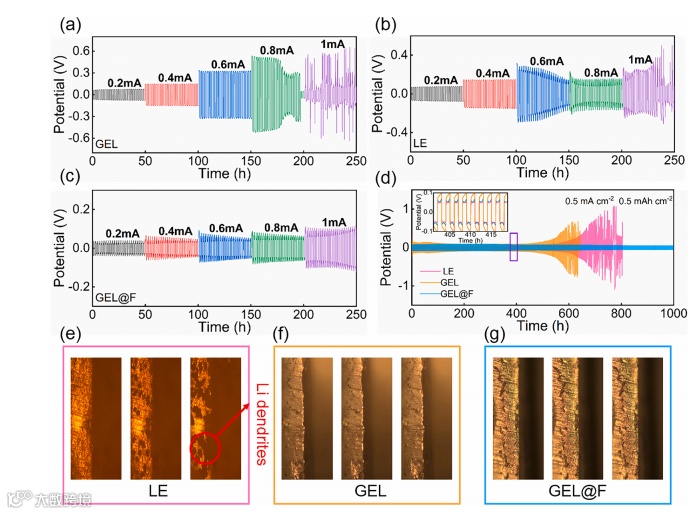图3. (a-c)LE、GEL和GEL@F对称电池临界电流密度和(d)对称电池在0.5 mA cm-2电流密度下的循环性能。光学显微镜观察(e)Li|LE|Li、(f)Li|GEL|Li和(g) Li|GEL@F|Li中的锂沉积。