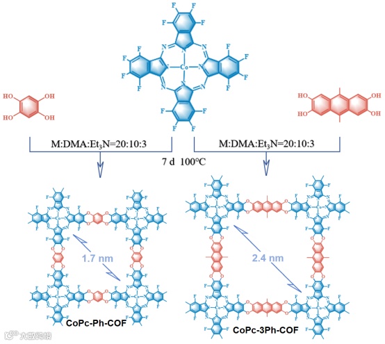 图2. 富氮共轭酞菁基介孔COFs的设计与孔径调控