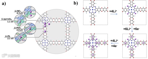 开发富氮共轭酞菁基介孔COFs材料有效提高了Li+的迁移效率。理论计算表明,COFs的纳米多孔结构提供了有利于Li+转移的通道,使其在框架不发生分段运动的情况下跳跃,其反应过程如下: