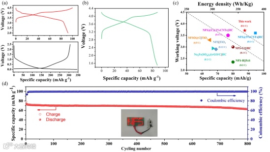 Na2.6Fe1.7(SO4)3@CNTs正极显示出卓越的长期循环稳定性,在 5 C下循环 1000 次后,其容量仍能保持初始容量的 82.6%,在 10 C循环 3000 次后,其容量仍能保持初始容量的71.1%。和商业化硬碳(HC)负极组装成的Na2.6Fe1.7(SO4)3@CNTs//HC 全电池在0.1C下的放电比容量为 87.62 mAh/g,平均工作电压为 3.71 V,质量能量密度超过 320 Wh/kg(基于活性阴极材料的质量)。在 2 C 倍率下循环 800 次后,全电池显示出卓越的循环稳定性,容量保持率达到 85.6 %。