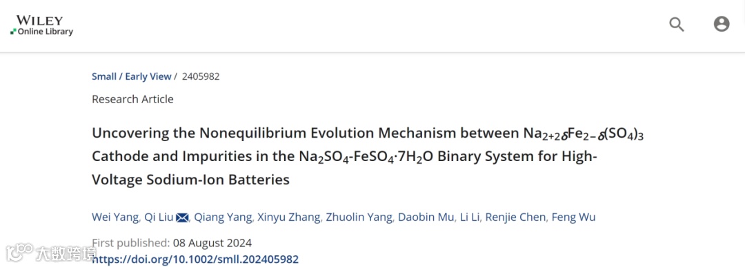 近日,来自北京理工大学的吴锋院士团队刘琦研究员课题组,在国际知名期刊Small上发表题为“Uncovering the Nonequilibrium Evolution Mechanism between Na2+2δFe2-δ(SO4)3 Cathode and Impurities in the Na2SO4-FeSO4·7H2O Binary System for High-Voltage Sodium-Ion Batteries”的研究性文章。研究者们通过调整 Na2SO4-FeSO4·7H2O 二元体系的配比,系统地研究了 Na2+2δFe2-δ(SO4)3 与杂质之间的非平衡演化机制,确定了0.765的最优比例,以及富Fe杂质Fe3O4和富Na杂质Na6Fe(SO4)4对系统结晶动力学、离子扩散动力学和电化学性能的影响。