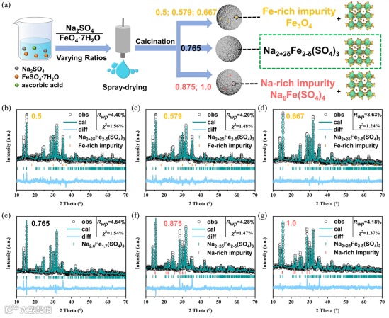 图1. a)合成路线示意图,以及Na2SO4/FeSO4-7H2O 的比例分别为 b) 0.5、c) 0.579、d) 0.667、e) 0.765、f) 0.875 和 g) 1.0)时的粉末 XRD 精修图谱。