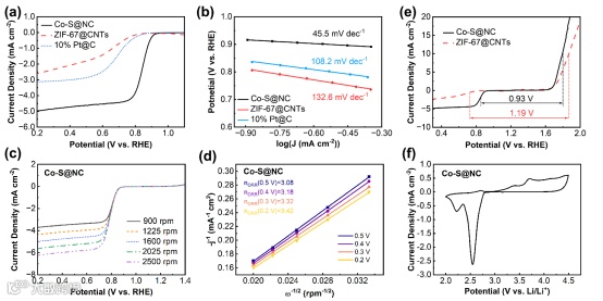图4. (a)ZIF-67@CNTs、10% Pt@C和Co-S@NC在1600 rpm转速,20 mV s-1,O2饱和的0.1 M 氢氧化钾溶液中的LSV曲线,(b)及相关的塔菲尔曲线,(c)Co-S@NC催化剂在不同转速下的ORR极化曲线,(d)及相关的不同电极电位下的Koutecky-Levitch曲线,(e)ZIF-67@CNTs和Co-S@NC在1600 rpm转速, O2饱和的0.1 M 氢氧化钾溶液中的ORR/OER双功能催化活性,(f)Co-S@NC在锂空气电池中以0.1 mV s-1速度扫描的CV曲线