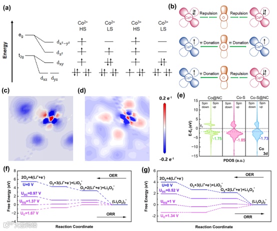 图3. (a)钴的3d轨道分裂和不同价态下钴的3d轨道在不同自旋态的电子排布,(b)Co3+-O-Co3+, Co2+-O-Co2+ 和Co3+-O-Co2+电子相互作用,不同体系的差分电荷密度图(c)Co-S模型,(d)共存模型,(e)三种模型的局域态密度分析及对应的d带中心,ORR和OER过程中自由能变化(a)Co-S@NC的(100)晶面和(b)Co1-xS的(100)晶面