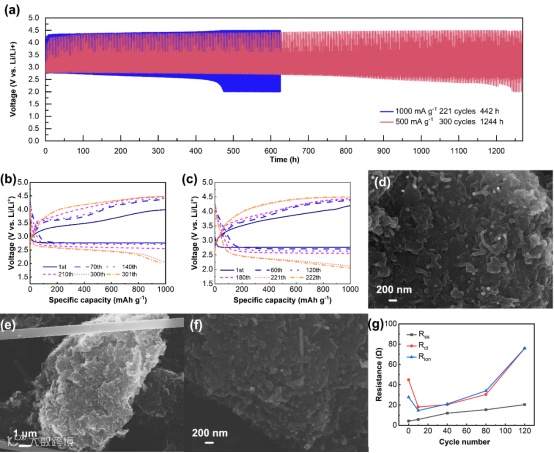 图6. (a)采用了Co-S@NC为空气正极催化剂的锂空气电池在1000 mAh g-1的容量限制和500,1000 mA g-1电流密度下的循环性能。电池在(b)500 mA g-1和(c)1000 mA g-1电流密度下的电压-容量曲线,Co-S@NC催化剂在1000 mAh g-1的容量限制和1000 mA g-1电流密度,(d)循环80周后的表面和(e)正极深层和(b)循环160周之后表面的SEM图,采用Co-S@NC正极催化剂在不同循环周数后的(g)等效电路的阻抗变化
