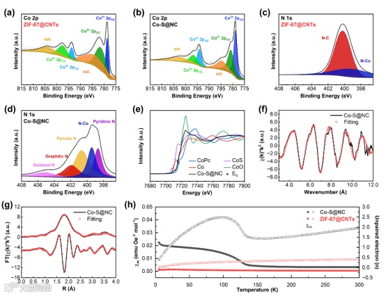 图2. (a)ZIF-67@CNTs和(b)Co-S@NC的高分辨率Co 2p谱,(c)ZIF-67@CNTs和(d)Co-S@NC的高分辨率N 1s谱,(e)Co K-edge的X射线近边吸收谱,Co-S@NC的(f)k3加权的K空间中的EXAFS和拟合曲线,(g)R空间的FTEXAFS和拟合曲线,(g)ZIF-67@CNTs和Co-S@NC的磁化率-温度曲线和计算的未配对电子数