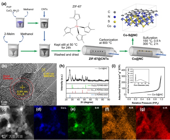 图1. (a)Co-S@NC的制备流程示意图和化学结构,(b)Co-S@NC的HRTEM图,(c)Co-S@NC的高角环形暗场扫描透射电子显微镜图和对应的(d)Co元素,(e)S元素,(f)N元素,(g)C元素能量谱,(h)Co-S@NC的XRD衍射图谱,(i)Co-S@NC氮等温吸附-解吸曲线与孔径分布