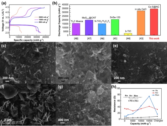 图5. (a)采用Co-S@NC催化剂的锂空气电池在500,1000,2000 mA g-1电流密度,2.0-4.5的恒流充放电曲线,(b)最近报道的正极催化剂的在锂氧气电池中最大放电容量的比较,(c)原始空气正极,在1000 mA g-1电流密度下放电深度为(d)1000 mAh g-1,(e)10000 mAh g-1,(f)20000 mAh g-1和(g)在1000 mA g-1电流密度下完全充电(34587 mAh g-1)后的SEM图片,(h)采用Co-S@NC正极催化剂的锂空气电池在不同放电深度和完全充电后的相关联的等效电路的阻抗变化