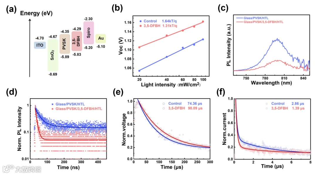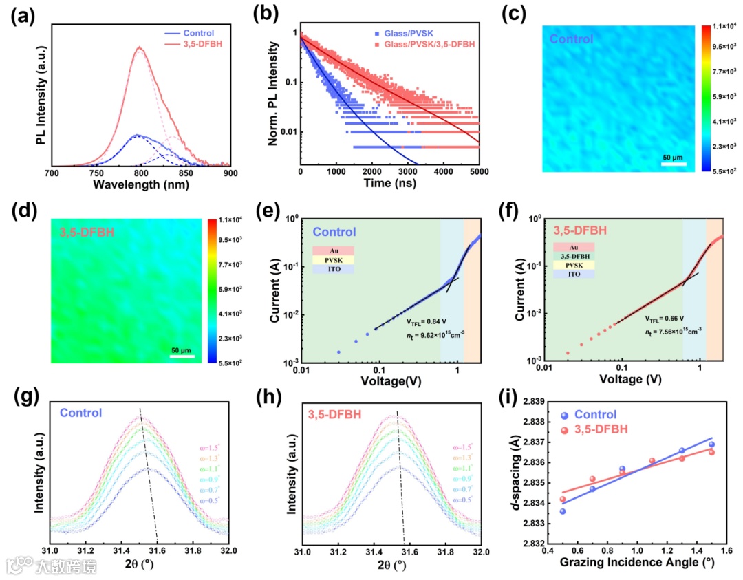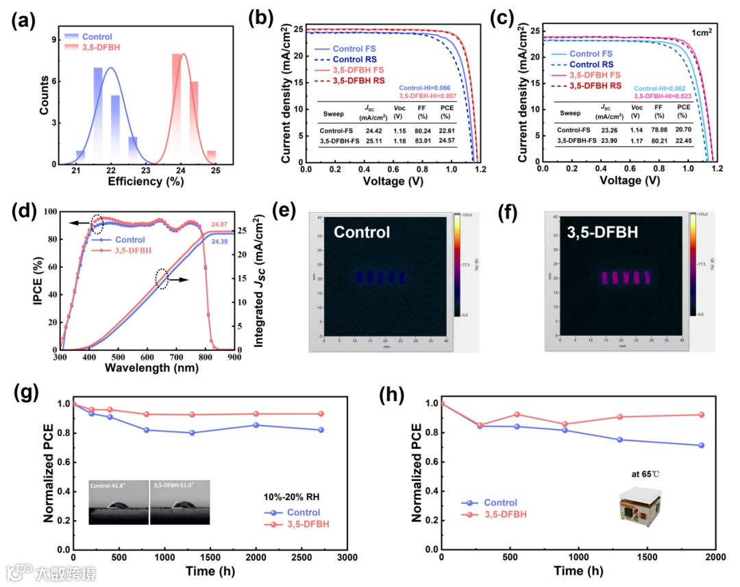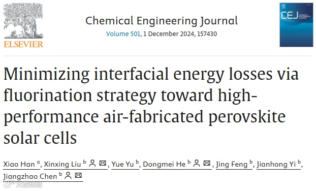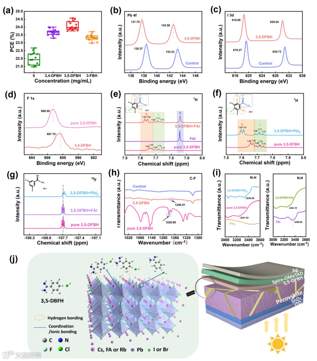 近年来,有机-无机金属卤化物钙钛矿(ABX3)因其优异的光电特性而备受关注。本研究工作发现基于n-i-p结构的钙钛矿太阳能电池(PSCs)中,钙钛矿层(Rb0.02(FA0.95Cs0.05)0.98PbI2.91Br0.03Cl0.06)和空穴传输层(Spiro-OMeTAD)界面处因离子迁移导致的亚带隙能带结构和陷阱辅助的非辐射复合依然限制着功率转换效率(PCE)和稳定性的进一步提高。基于以上问题,研究人员引入了一种简单而有效的氟化策略,通过同时实现缺陷钝化、拉伸应变释放和界面能带调控来抑制这些复合损失。氟(F)基团的引入不仅通过强化学键增强了缺陷钝化,还提高了钙钛矿薄膜和器件的抗湿性。结果证明3,5-二氟苯胺盐酸盐(3,5-DFBH)修饰可以显著提升钙钛矿太阳能电池效率,并获得了24.57%冠军PCE。此外,长期稳定性也显著改善,器件在10%-20%相对湿度下储存2700小时后,这些器件的效率依然保持着初始值的90%以上。即使在65℃下加热1700小时后,效率仍保持在初始值的90%以上。这项工作提供了一种可行的途径,通过氟化策略来抑制离子迁移并进一步提高钙钛矿太阳能电池的光伏性能和稳定性。