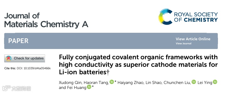 近日,来华南理工大学的黄飞教授与唐浩然博士,在国际知名期刊Journal of Materials Chemistry A上发表题为“Fully Conjugated Covalent Organic Frameworks with High Conductivity as Superior Cathode Materials for Li-ion Batteries”的研究论文。该文章在全共轭共价有机框架(COFs)材料研究领域取得重大进展,开发出具有高导电性和高比容量的COF材料,为高性能LIBs的正极材料提供了新选择。