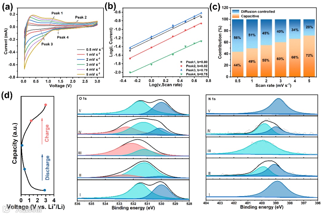Figure 4. (a) 在不同扫描速率下TBI-COF-O的循环伏安(CV)曲线(0.5 mV s−1, 1 mV s−1, 2 mV s−1, 3 mV s−1, 4 mV s-1, 和 5 mV s−1);(b) TBI-COF-O峰值电流对数与扫描速率对数的线性拟合;(c) TBI-COF-O的电容和扩散控制过程的归一化容量贡献;(d) 在充电和放电过程中对应的TBI-COF-O的X射线光电子能谱(XPS)能量谱,包括O1s和N1s。