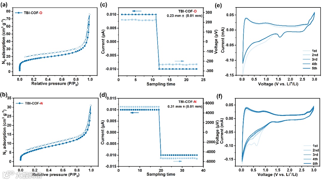 Figure 2. (a) TBI-COF-O和(b) TBI-COF-N在77K下的氮气吸附等温线;(c) 使用四点探针法测量压制的TBI-COF-O和(d) TBI-COF-N的电导率;(e) TBI-COF-O和(f) TBI-COF-N在0.5 mV s−1下的循环伏安曲线。