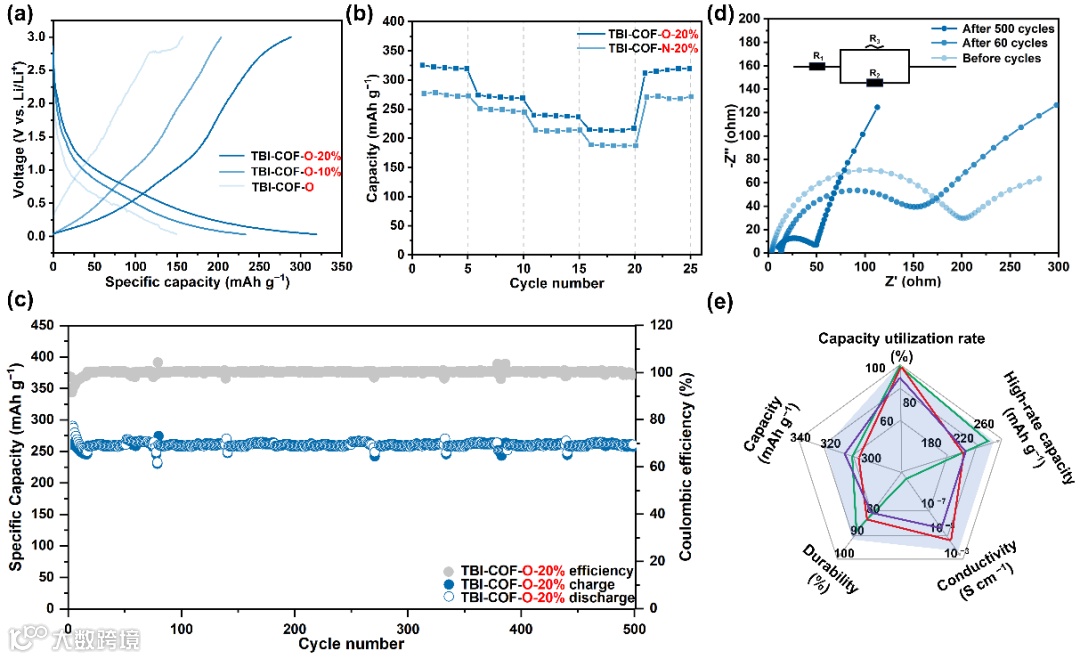 Figure 3. 基于COF的锂离子电池性能。(a) 不同导电碳含量的TBI-COF-O的比容量;(b) TBI-COF-O和TBI-COF-N的倍率性能;(c) 在1C放电率下TBI-COF-O正极的长期循环稳定性;(d) 不同循环次数下TBI-COF-O的电化学阻抗谱,提供了等效电路模型:R1为欧姆电阻,R2为电荷转移电阻,R3为恒相元件阻抗;(e) TBI-COF-O的性能雷达图,蓝色阴影(TBI-COF-N,红色曲线;HATN-AQ-COF,绿色曲线;PT-COF50,紫色曲线)。