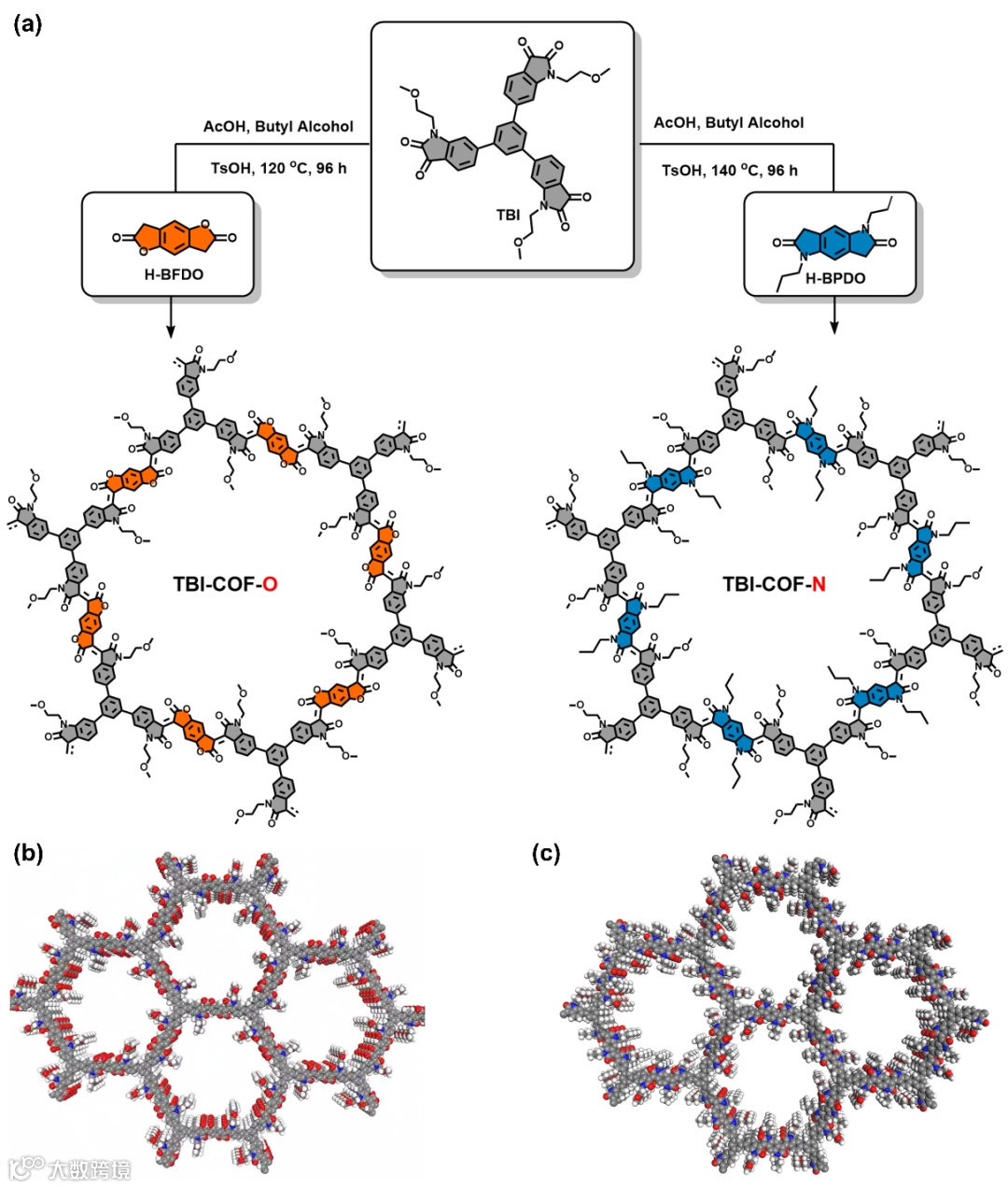 Figure 1. 设计和制备六角形COF材料。(a) 在溶剂热条件下合成TBI-COF-O和TBI-COF-N。(b) TBI-COF-O的拓扑结构,(c) TBI-COF-N的拓扑结构(C, 灰色;O, 红色;N, 蓝色;H, 白色)。